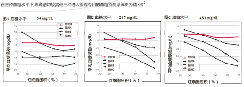 思锐谱不受红细胞压积的影响。专利的“测量校正”技术,确保思锐谱TM是目前唯一的能够测量校正红细胞压积的医院专用血糖监测系统,也是唯一真正意义上不受HCT干扰的血糖监测系统。